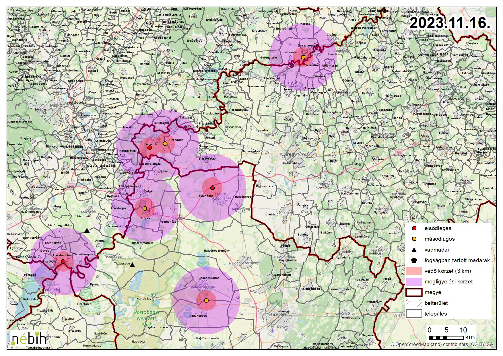 Hajdú-Bihar vármegye területének - Balmazújváros és Nagyhegyes települések területét érintő - a mellékelt térkép szerinti bel-, és külterületére magas patogenitású madárinfluenza megállapítása miatt 3 km-es sugarú körben védőkörzetet rendelek el.